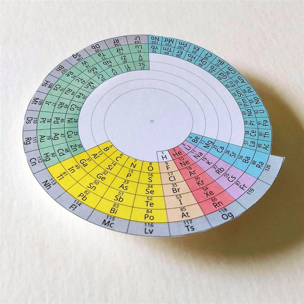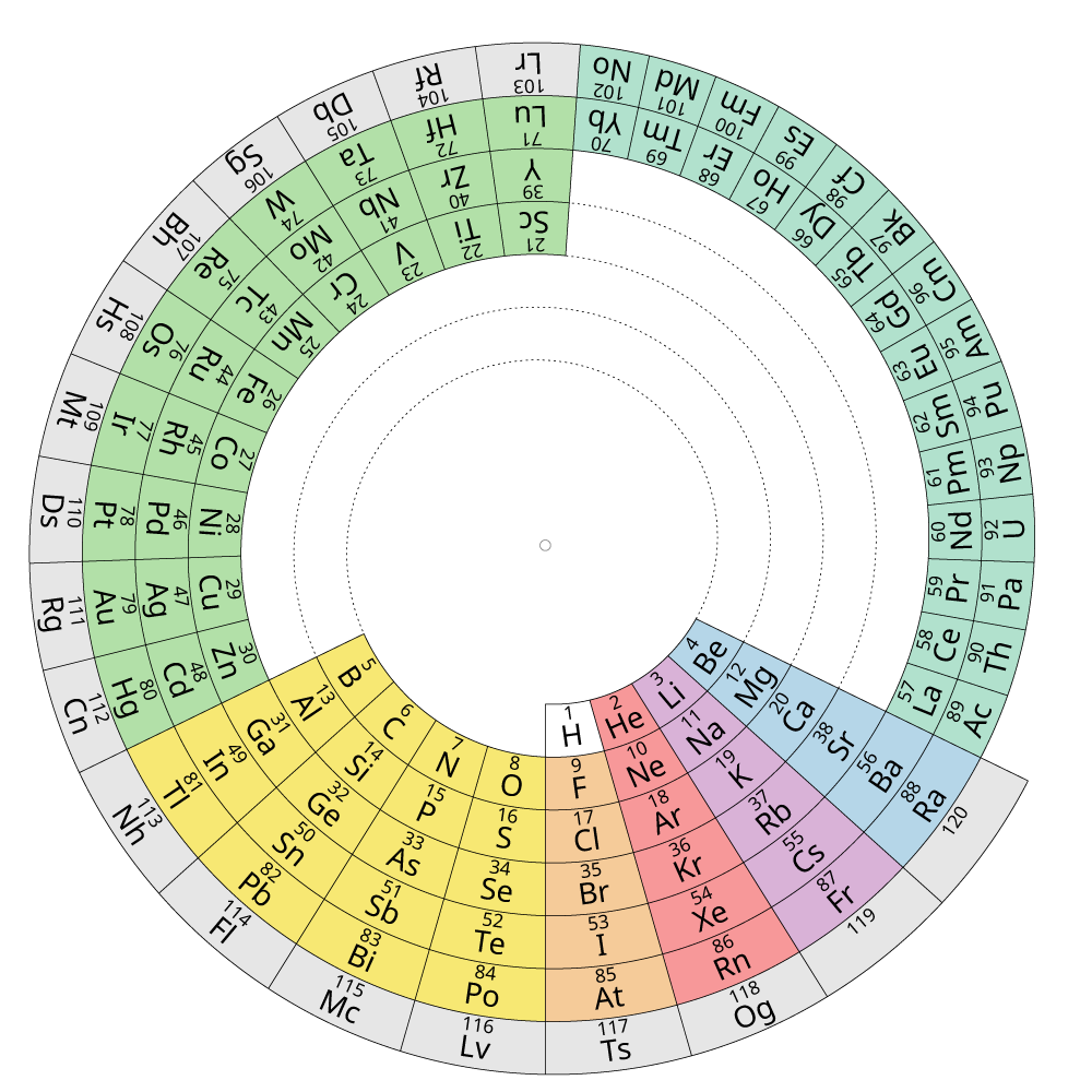 In this periodic table, the elements are arranged in a single flat spiral (not concentric circles).